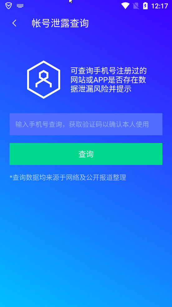 进入「账号泄露查询」界面,输入自己的常用手机号,然后获取验证码以确认是本人使用。