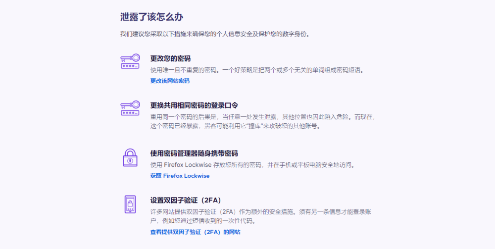 如果发现数据被泄露了该怎么办,Firefox Monitor很贴心地在这里给出了一些建议。