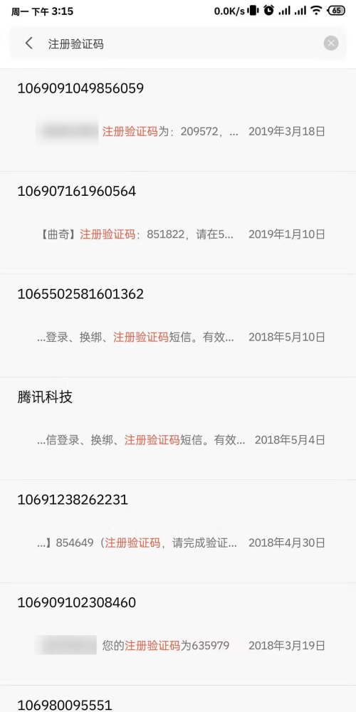 所以呢我们只需要短信里面搜索关键词“验证码”或者“注册验证码”,一般都能找到我们注册过的一些网站。